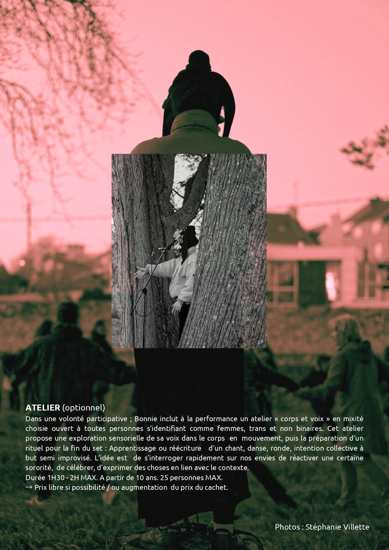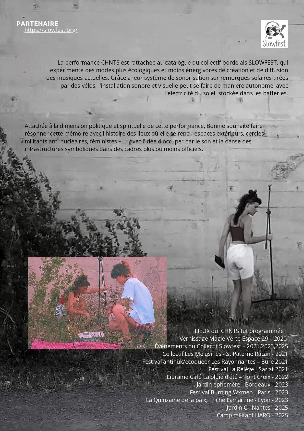 CHNTS fait référence au terme de “chant” en anglais; intraduisible car il fait allusion à la fois à quelque chose de politique, de l’ordre du slogan ou du chant de lutte, mais aussi à quelque chose de spirituel, de l’ordre de la prière ou de l’incantation.CHNTS est une performance femmage à la lutte antinucléaire des femmes de Greenham Common, base de missiles installée en Angleterre dans un contexte de guerre froide. Composée à partir des paroles écrites durant ces nombreuses nuits d’occupations, cette nouvelle mise en musique, tente par la création de boucles de voix et d’images, de faire revivre ces rondes d’émancipation et de résistance joyeuse. Sous sa cagoule de fleurs, Bonnie Dégaine mêlent transe polyphonique, sonorités celtiques, cris et souffles cathartiques pour partager l'énergie de ces femmes, pionnières écoféministes anglosaxonnes ayant expérimenté de nouvelles méthodes et inventé d'autres imaginaires de lutte.