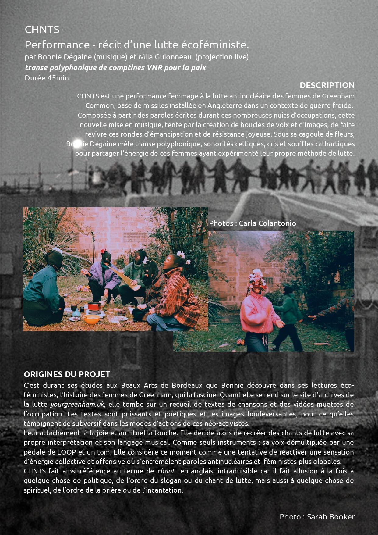 CHNTS fait référence au terme de “chant” en anglais; intraduisible car il fait allusion à la fois à quelque chose de politique, de l’ordre du slogan ou du chant de lutte, mais aussi à quelque chose de spirituel, de l’ordre de la prière ou de l’incantation.CHNTS est une performance femmage à la lutte antinucléaire des femmes de Greenham Common, base de missiles installée en Angleterre dans un contexte de guerre froide. Composée à partir des paroles écrites durant ces nombreuses nuits d’occupations, cette nouvelle mise en musique, tente par la création de boucles de voix et d’images, de faire revivre ces rondes d’émancipation et de résistance joyeuse. Sous sa cagoule de fleurs, Bonnie Dégaine mêlent transe polyphonique, sonorités celtiques, cris et souffles cathartiques pour partager l'énergie de ces femmes, pionnières écoféministes anglosaxonnes ayant expérimenté de nouvelles méthodes et inventé d'autres imaginaires de lutte.